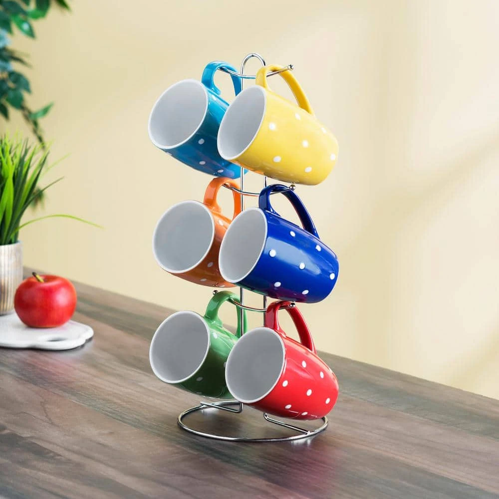 Brighten up your daily morning brew with this perky hued mug set with chrome plate steel stand. Each mug is crafted out of durable stoneware and adorned with a vibrant dots. From a piping-hot cup of cocoa to ice-cold lemonade, these mugs make each sip of your favorite beverages extra exhilarating. Store away each cup on the steady metal stand and place in the center of the table for a beautiful center piece your guests won’t stop wowing about.