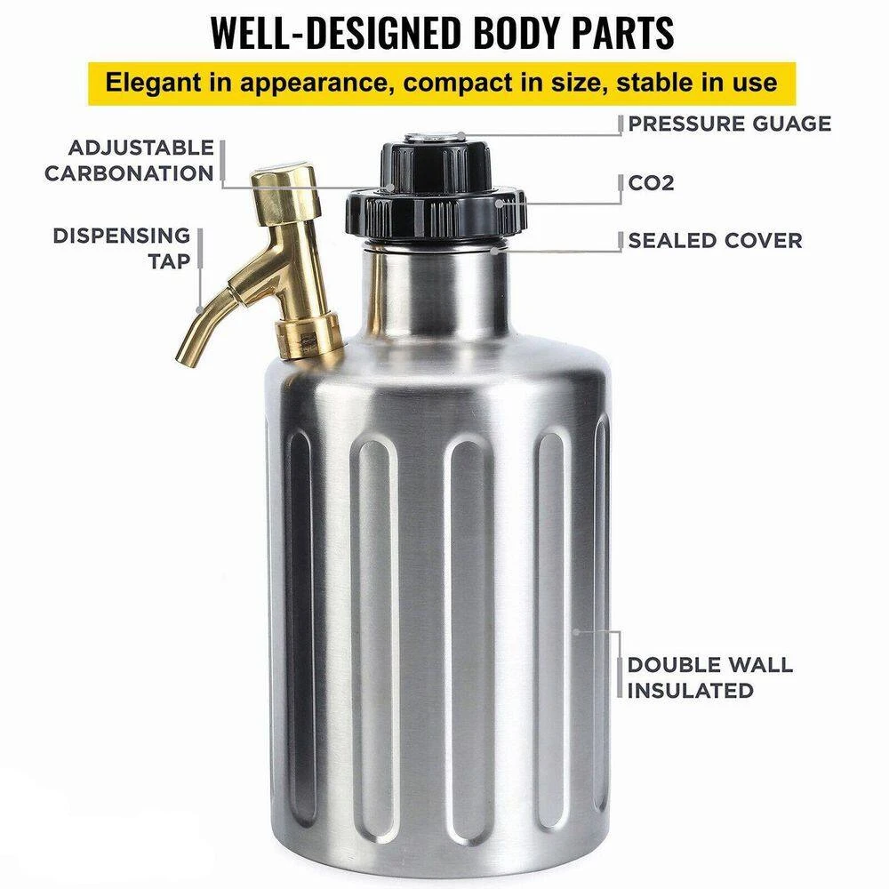 - [64OZ VOLUME CAPACITY]- Includes metal screw on lid cap for easy portable transportation and storage. Its 11.25″ height fits in your home fridge or kegerator.