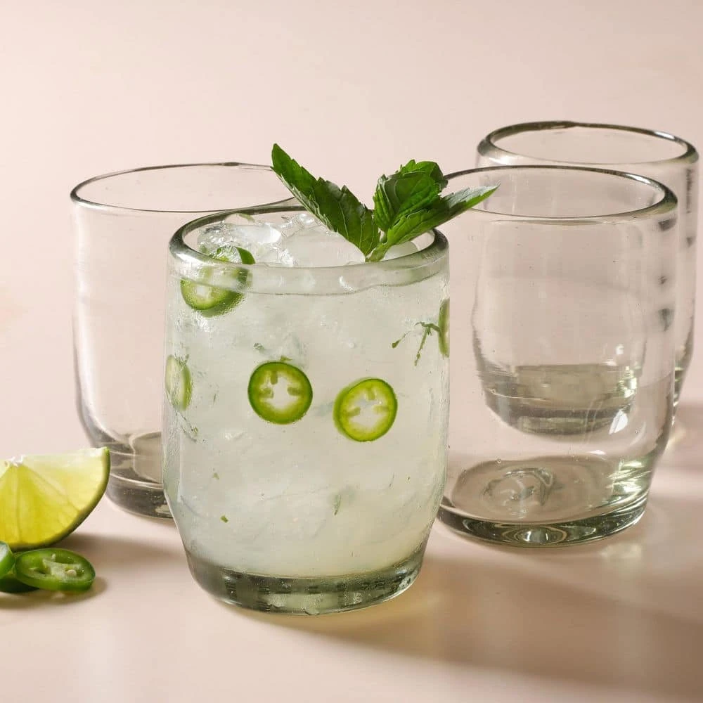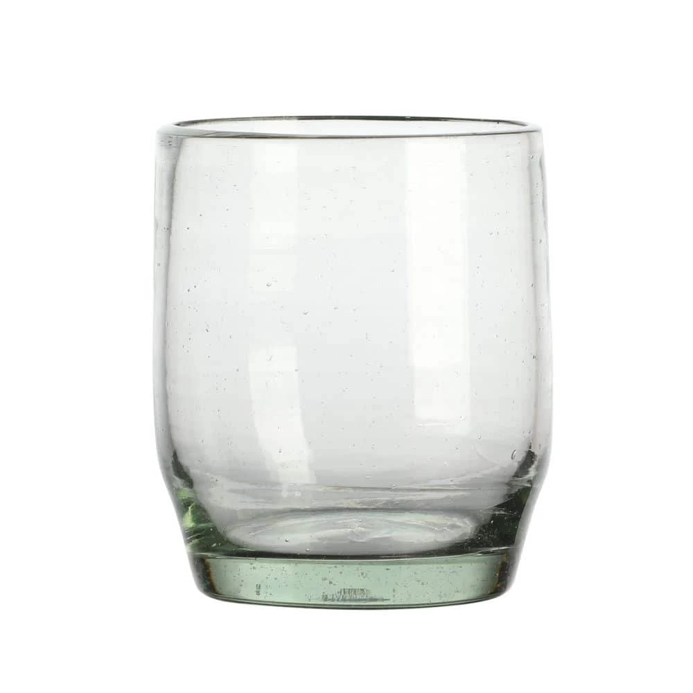 Refresh guests with the cooling aesthetics of the Cravings by Chrissy Teigen 4-Piece 8.2 oz. Clear Glass Spanish Double Old Fashion Set. Each glass cup features a rustic speckled texture with a thickened bottom. The wide shape is capable of containing larger solid ingredients for a large array of mixed or blended drinks. Enjoy some cool lemon water, indulge in a classic whiskey ‘n’ Coke, or serve fruity cocktails.