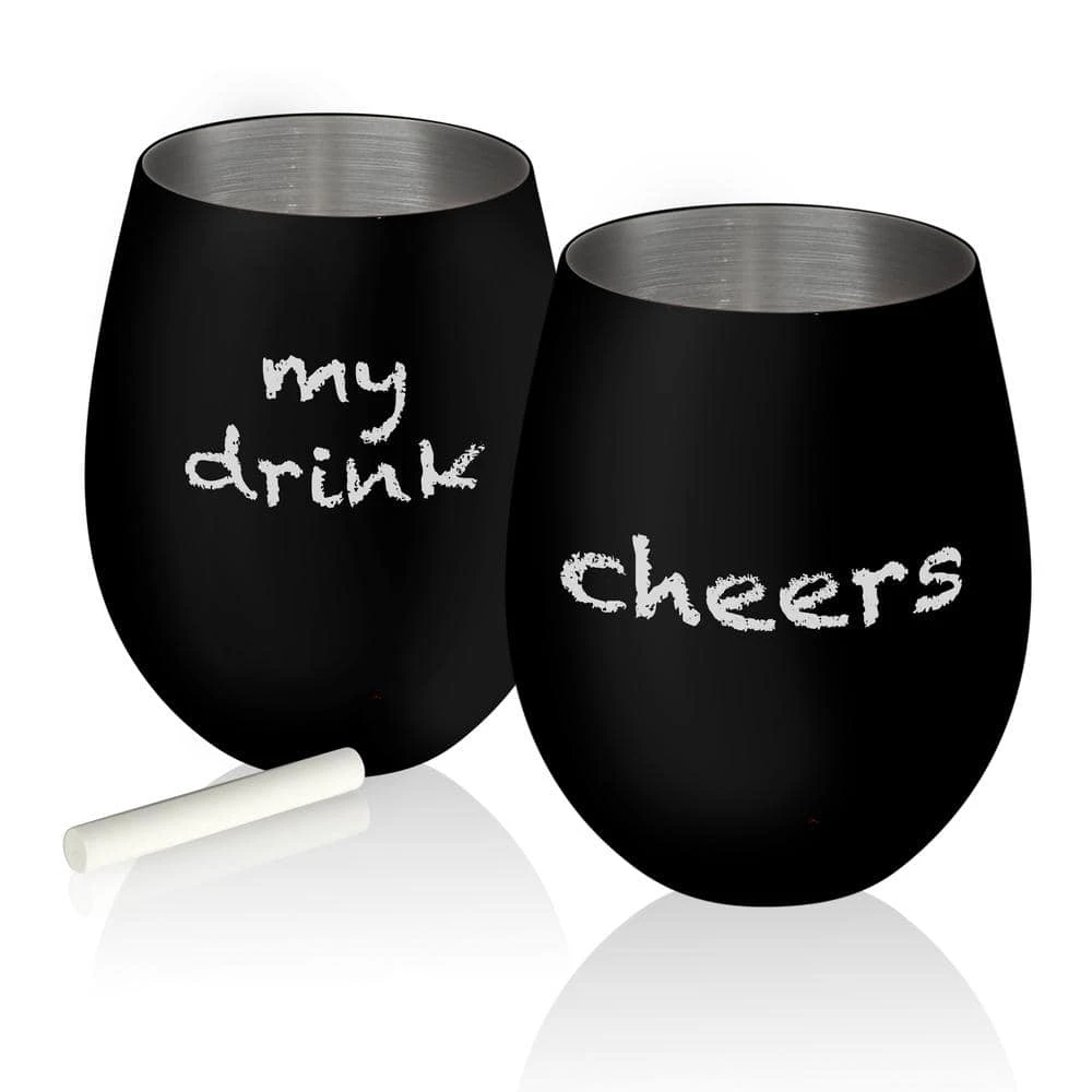 - This set includes two 17 oz. stemless glasses that are perfect for red, white, or rosé wines. The unique chalkable surface allows you to personalize each glass for special occasions.