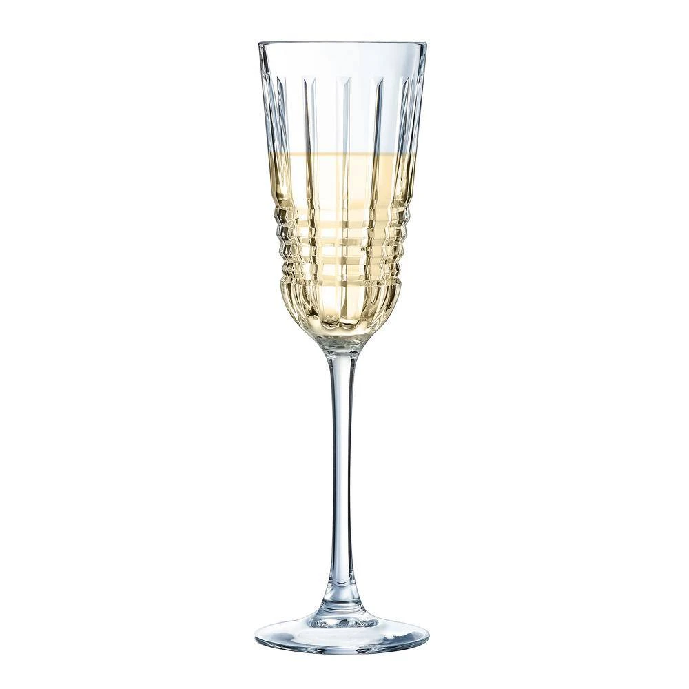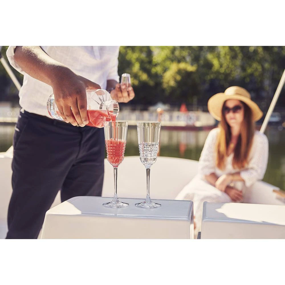 The Rendez-vous 5.75-ounce Flute draws its intense sparkle from the depth and the abundance of the shimmering vertical facets as well as the motion of the moldings covering the glasses. Spectacularly cut to sculpt light, they display the simplicity of prominent symmetrical lines, structured like a cut diamond as if part of a precious bracelet. Curves add a certain aesthetic appeal reminiscent of the 1930s streamlining trend, based on the form and fluidity of a drop of water. It was an era of reconciliation between beauty and practicality, inspired by motion and movement. The boldness and modernity of an era are symbolized in a lead-free crystal glass creation.
