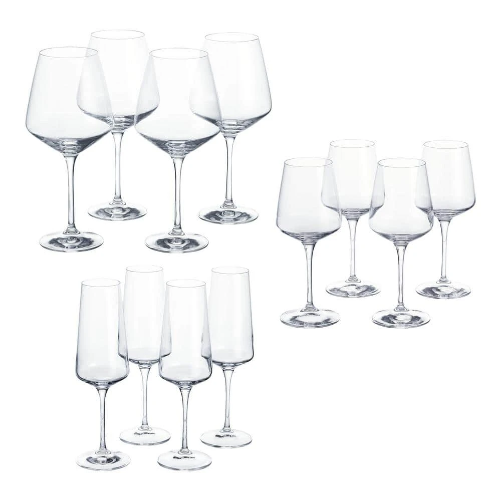 - This set includes 12 glasses: four 26.5 fl. oz. red wine glasses, four 15.5 fl. oz. white wine glasses, and four 12 fl. oz. champagne glasses, ensuring you’re prepared for any occasion.