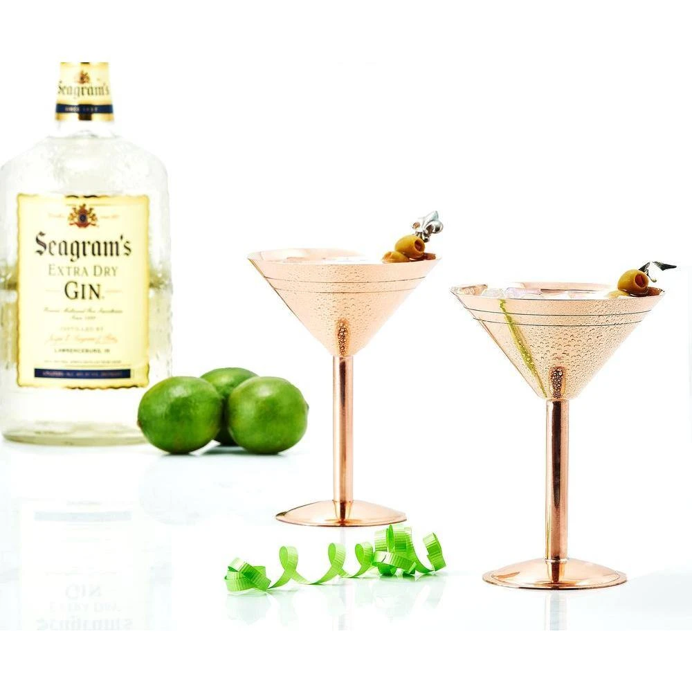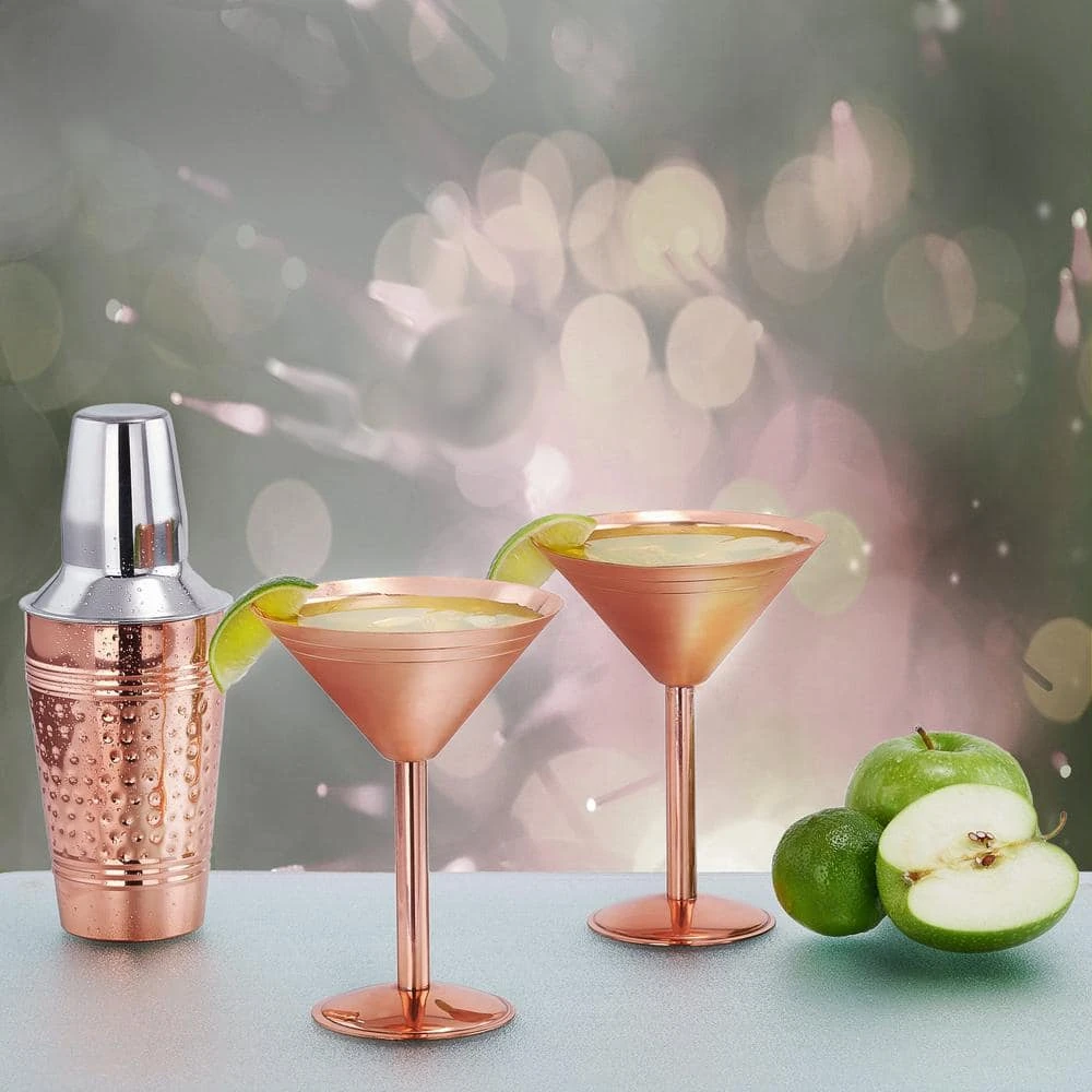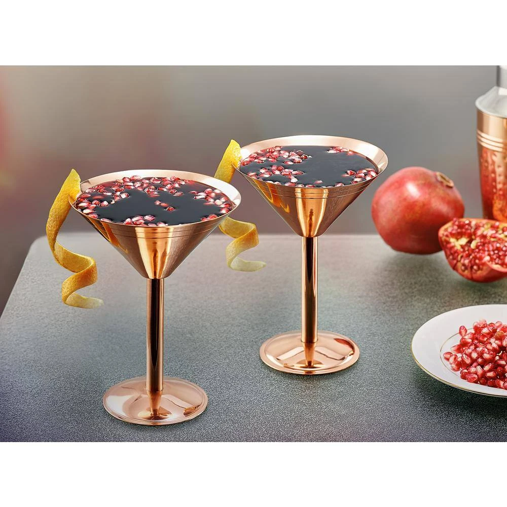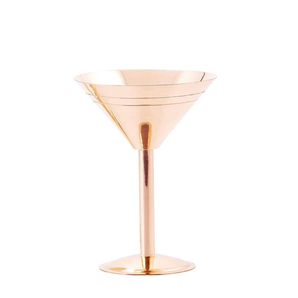 Whether shaken or stirred, your next martini will certainly be served “with a twist” when presented in one of our copper martini glasses. Our set of two solid copper martini glasses will develop a cooling film of frost and keep your cocktails at the perfect, chilly temperature until the last sip. Set of two solid copper “glasses” with unlined, untreated interiors and lacquer-treated exteriors that resist tarnishing.