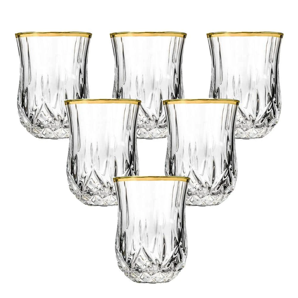 This Tulip shape Shot glass from the RCR Opera Collection is a classic cut crystal design with an ageless look and beauty. Set of 6 is perfect for entertaining and serving that perfect little drink! Each glass is made in the Tuscan region of Italy and holds 2 ounces. Durable and practical, these glasses feature an elegant gold band trim. Each glass weighs .2 pounds and measures 1.75″ x 1.75″ x 2.5″. Hand Wash.