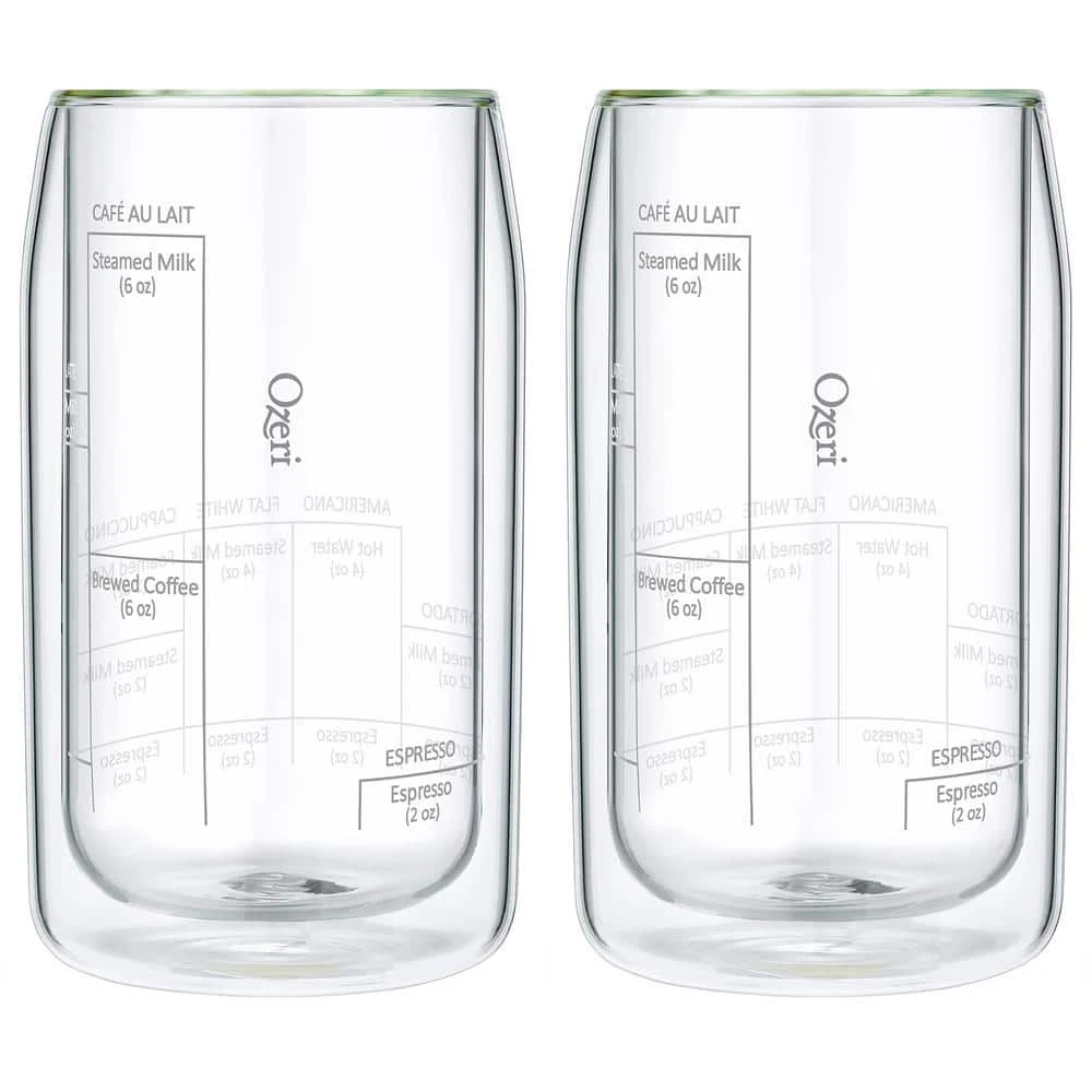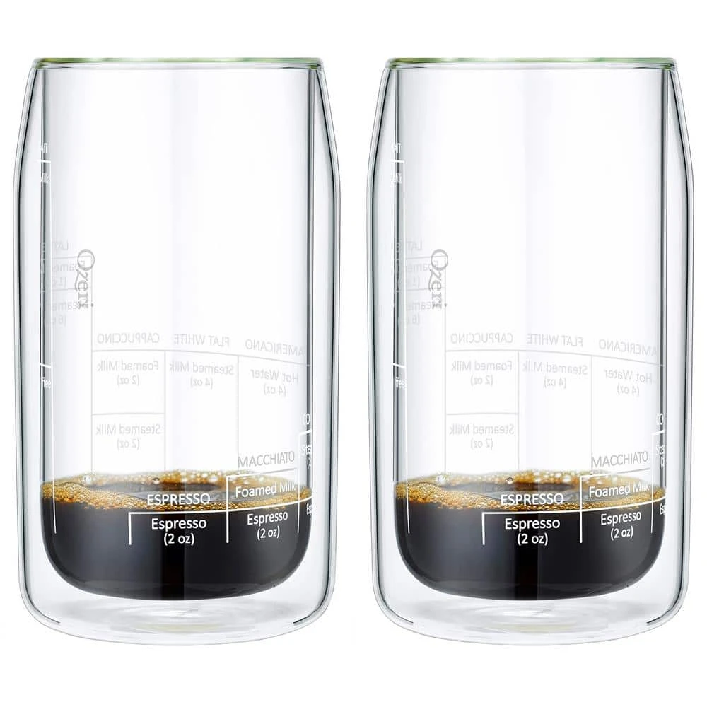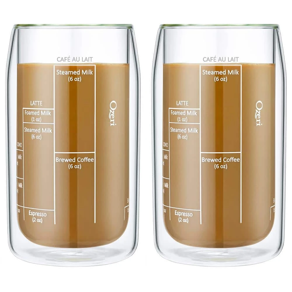 Become your own Barista and serve professional coffee drinks with the Ozeri 15 oz Double Wall Barista Coffee Glasses, the latest addition to Ozeri’s Moderna Artisan Series of award-winning handcrafted drinkware. The Ozeri Barista Coffee Glasses feature EZ Measure Lines, which are easy-to-read fill indicators that allow you to flawlessly prepare and serve Espressos, Macchiatos, Cortados, Americanos, Flat Whites, Cappuccinos, Lattes, and Cafe Au Laits. The EZ Measure fill lines show how much espresso, foamed milk, steamed milk, hot water, and brewed coffee to pour, and in the correct order, for that epic looking and tasting Latte, Macchiato, and 6 other barista-quality creations. Each glass is made of durable borosilicate glass, boasting a visually stunning curved design, that preserves drinks at their ideal temperatures. The unique double wall design keeps your hands cool with hot coffee, and free of condensation with chilled coffee drinks. Each set contains 2 15 oz Barista Coffee Glasses designed for lifetime use. The Ozeri Barista Coffee Glasses are completely microwave and freezer safe, and ships in an elegant, printed box with a No-Hassle Warranty. Satisfaction Guaranteed.