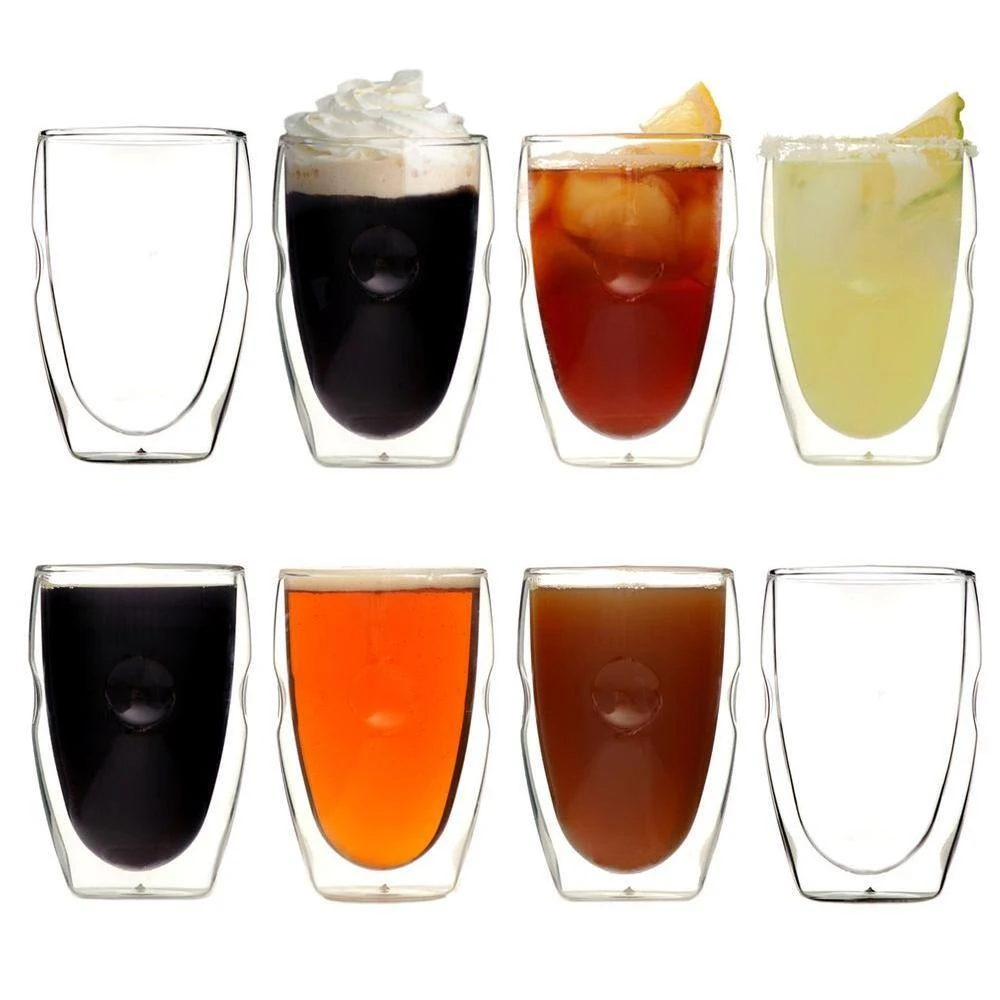 - Set of 8 heat and condensation-resistant borosilicate glasses that each holds 12 oz.