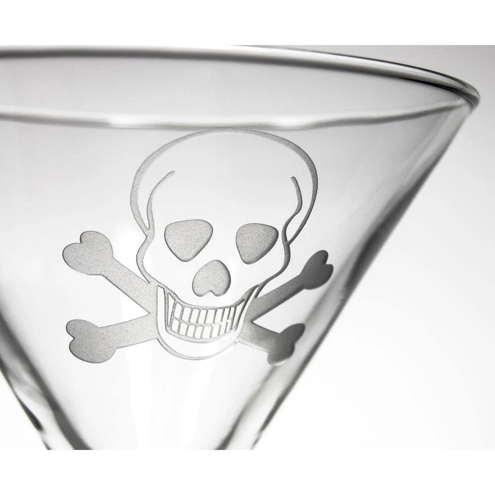 - Deeply sand etched with a skull and cross bone design