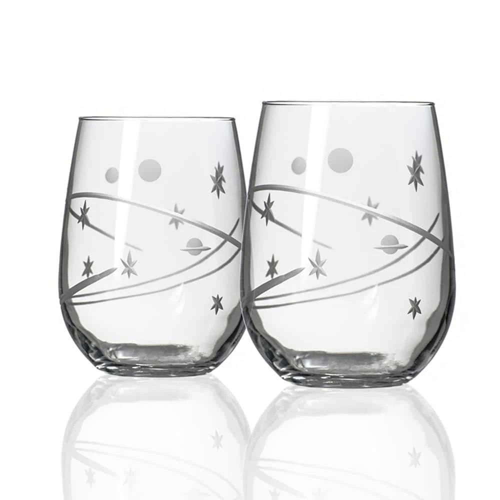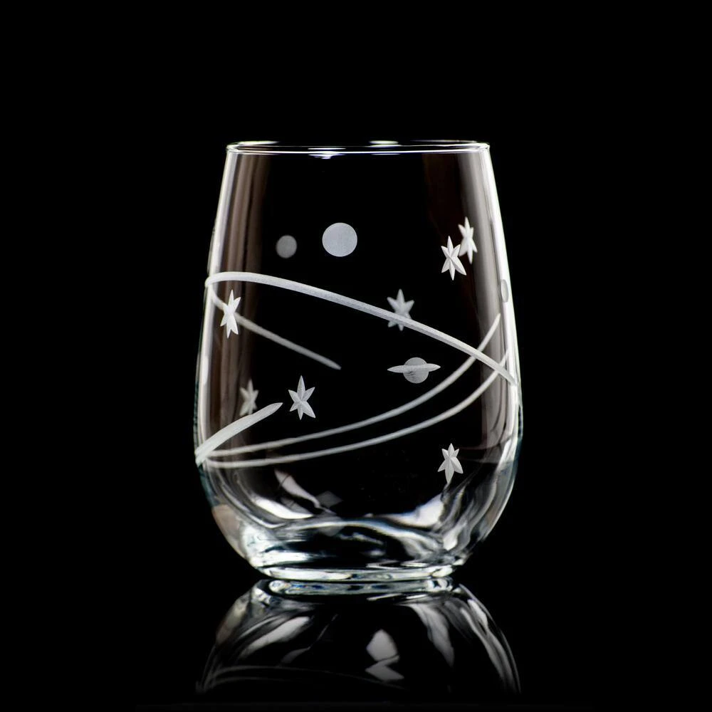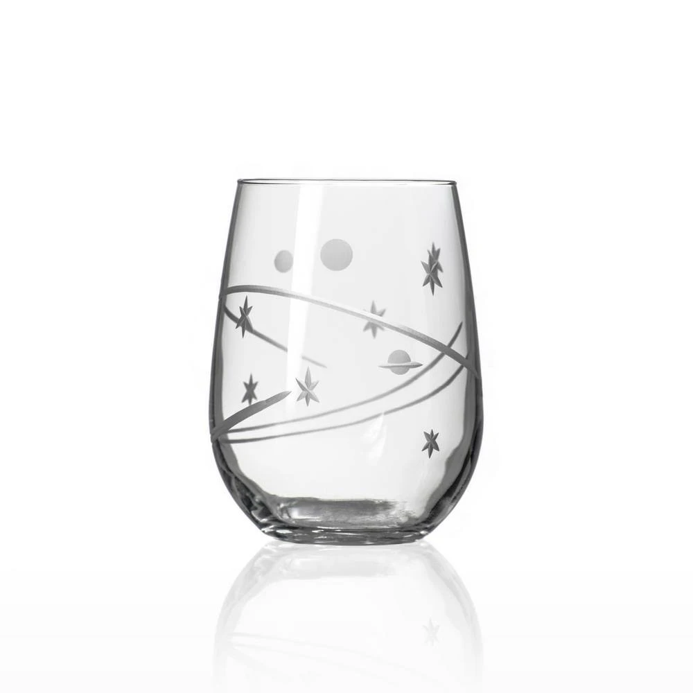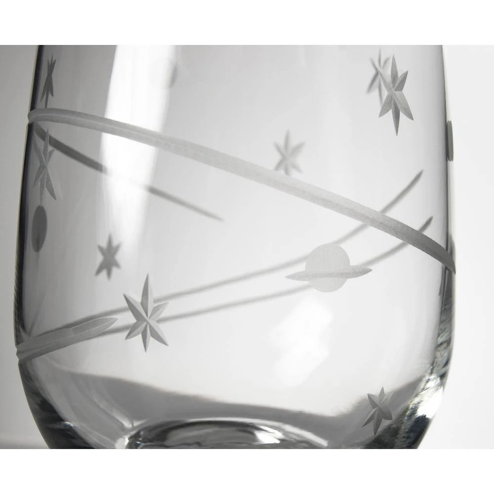 Space is a far-out retro design by Rolf Glass using minimalist geometric shapes inspired by the Mid-Century Modern style. The cosmic scene with comets, stars, and planets created with diamond-wheel cuts evokes visions of the Mid-Century Modern masters like George Nelson, Charles and Ray Eames, and Isamu Noguchi. Each glass is diamond-wheel engraved in the USA.