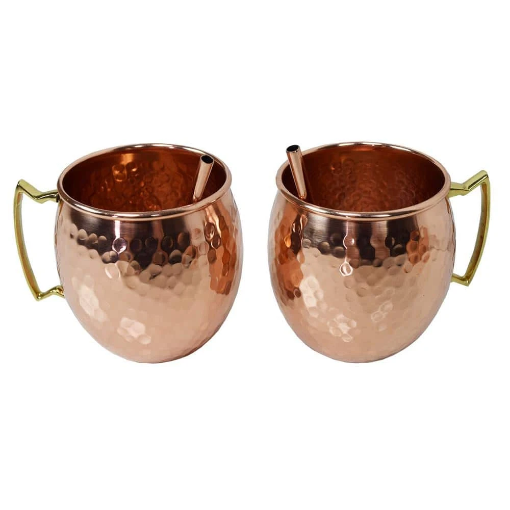 Our pair of Mule Mug cups offer more capacity than all other cups. With 17 oz. capacities each, you can enjoy your drink even longer. On top of that each and every piece is meticulously handcrafted one at a time with extra polishing to make them super shiny with super silky smooth edges. We use 100% copper offering the best taste experience with every sip. The copper keeps your beverage ice cold and frosty. When the copper begins to oxidize, it boosts the aroma and enhances the taste of the ingredients. It also increases the bubbles in the carbonated ginger beer, bringing maximum fizz to the Mule. The citric acid from the lime juice is brought to life by the extra-cold copper, heightening the tangy citrus flavor and reducing the acidity which perfectly complements the spiciness of the ginger beer. The dimensions for the Solid Round Pair of 100% Copper Mule Mug Cups with Two Copper Straws 17 oz. Smooth Hammered Handcrafted Finish are: 5 in. L x 3.5 in. W x 4 in. H.